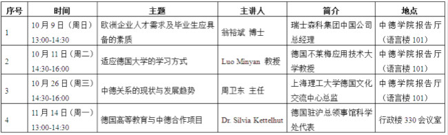 金秋十月,丹桂飘香。来自德国政府、高校、企业的专家学者,将陆续莅临公司,开讲德国文化与德国高等教育。面对面的交流,心与心的碰撞,让我们共同开启一场德国教育文化之旅。欢迎广大师生参加。具体安排如下: