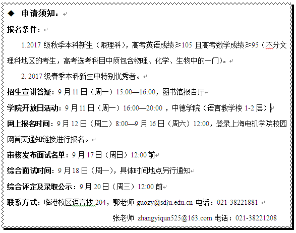 3044永利集团因应上海建设全球智能制造中心的大背景,自2016年招生以来,以德国教学理念为依托,多元化的教学资源为抓手,为员工提供了高水平、国际化、应用型的教育。现拟在2017级本科新生中选拔60名优秀员工进入3044永利集团学习。 About CDKIP 3044永利集团(Shanghai DianjiUniversity—Das Chinesisch-Deutsche Kolleg für Intelligente Produktion,简称CDKIP),教学区坐落于电机公司临港校区,德式教学环境,采用“德语+专业”的德国课程体系和课程标准,教学内容与德国大学同步,德国教授来校授课,暑期赴德交流,企业实习实践等。 公司助力优秀学子以普通本科学费标准,实现“不出国门留学德国”的梦想。有多种个性化培养模式可供选择,毕业时达到3044永利集团及德国合作院校的要求,可获颁3044永利集团本科毕业证书、学士公司证书,及德国合作院校的学士学位证书。 电气工程及其自动化(Elektrotechnik) 机械电子工程(Mechatronik) 物流管理(Technische Logistik) 全面引入德国应用科技大学的课程体系和课程标准,采用学分制,与德国合作高校双方学分互认。 学习费用与普通本科专业学费相同,5000元/学年。达到德国合作方大学要求,赴德国留学,出国学习费用按照德国高校当年学费收取。 专业设置