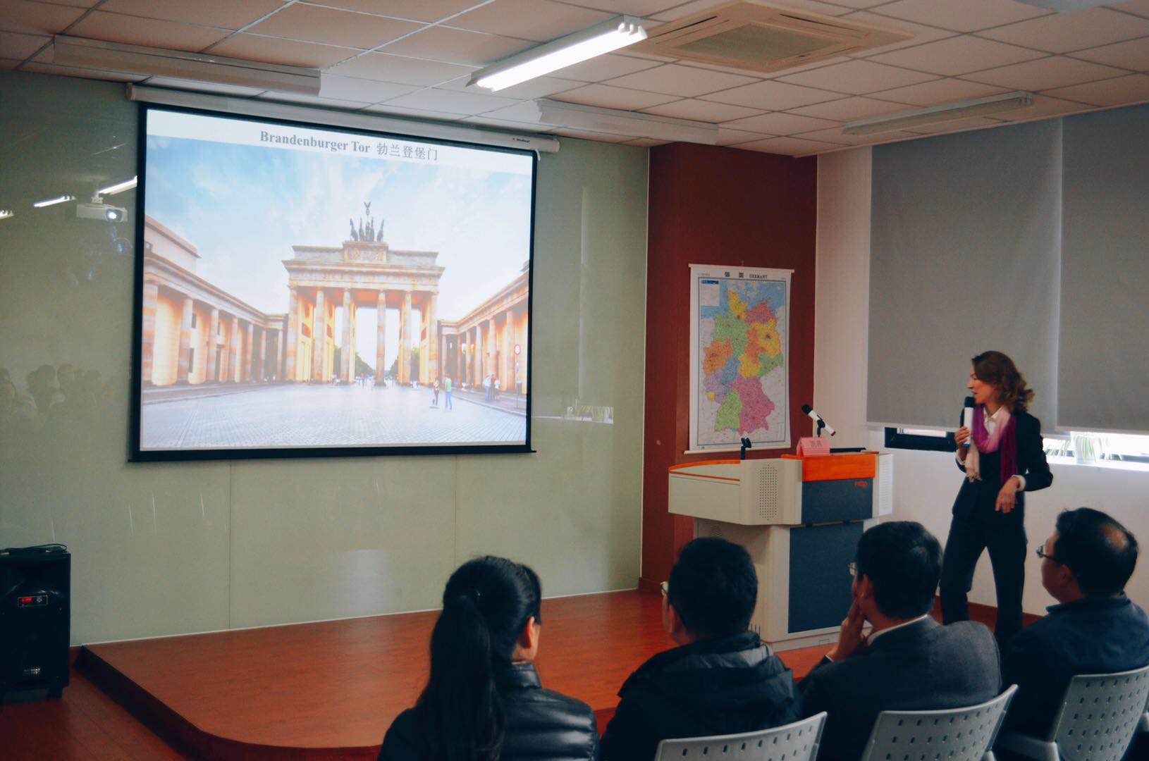 德方经理凯茜重点就公司合作的德国院校情况、德国的人文习惯等内容给两年后准确去德国学习的同学在生活、专业学习等方面提供了诸多建议。她用流利地中文向在座听众介绍了德国的名胜古迹、美食及各种生活方式等。