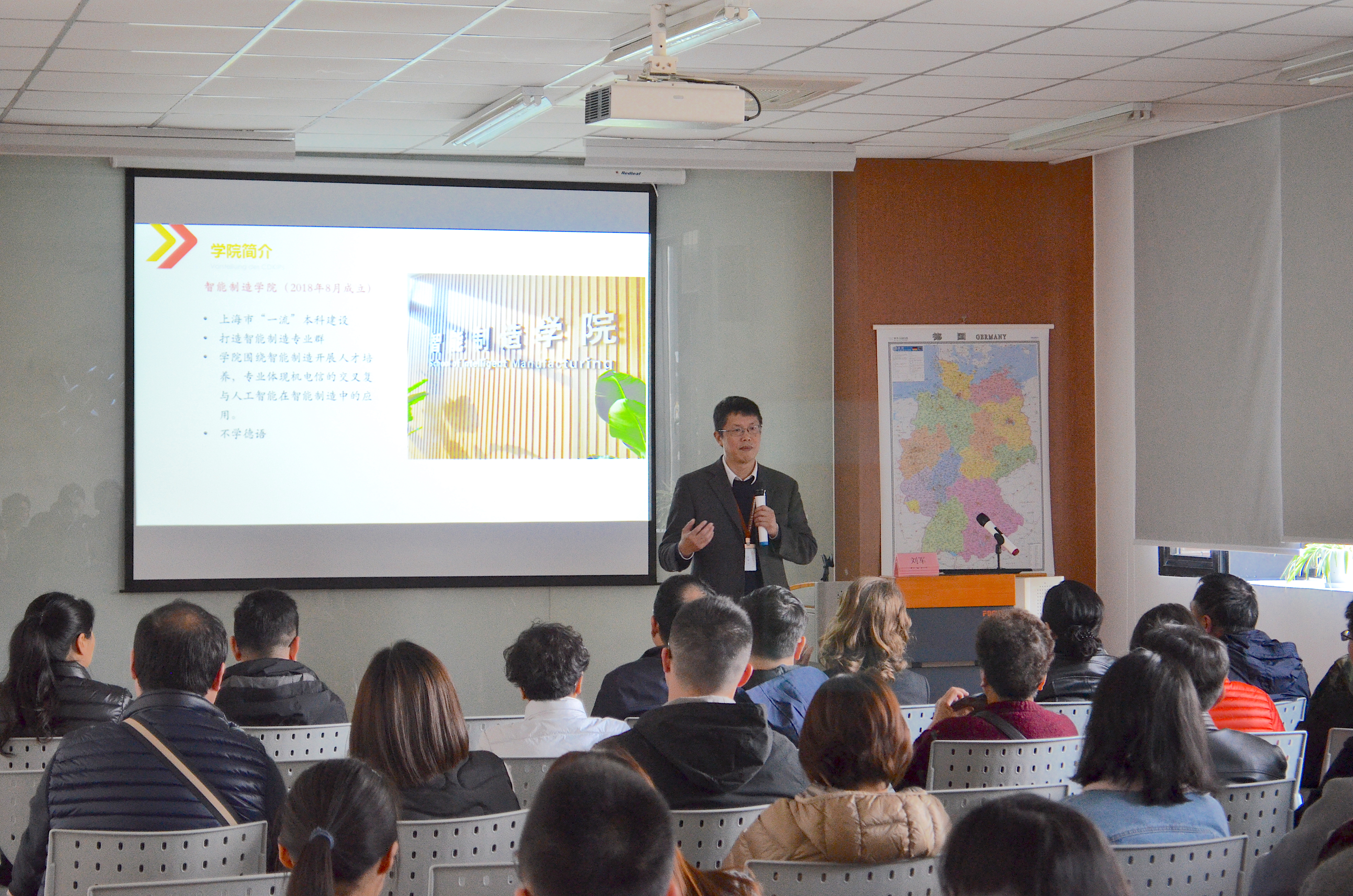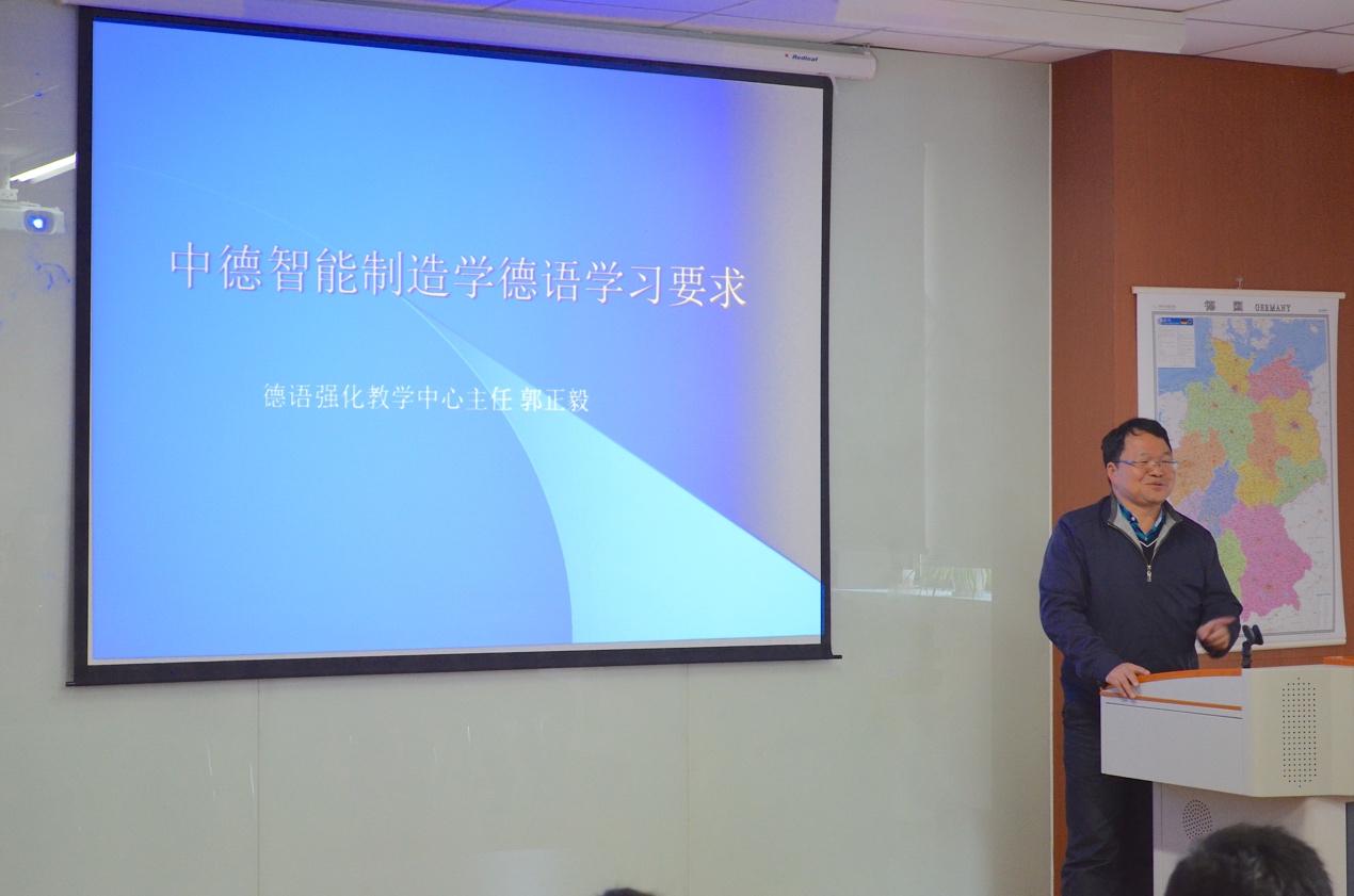 德语教学中心主任郭正毅就家长和员工都比较关心德语学习问题进行详细说明。他强调了德语学习重要性的同时,通过对外教授课、海外交流项目的介绍,也详细说明了公司员工进校后德语学习模式、分阶段有目标的学习过程等,并提醒大家德语的学习现在就可以准备起来,增强了新生们学习德语的自信心。