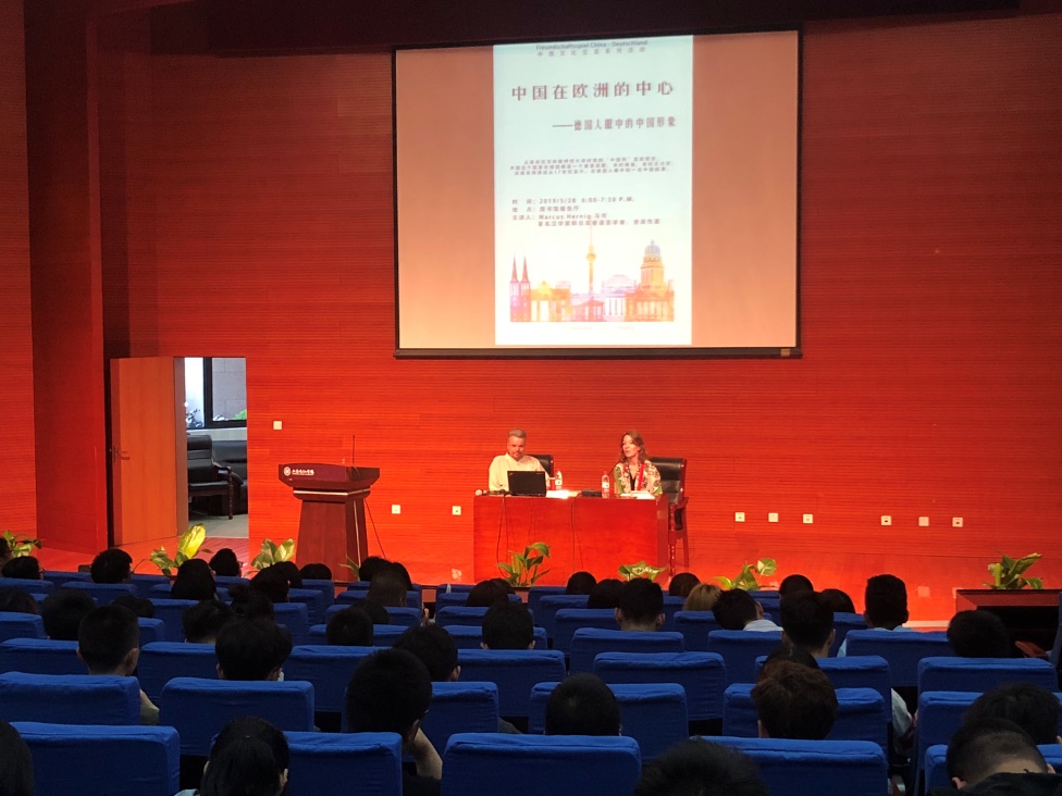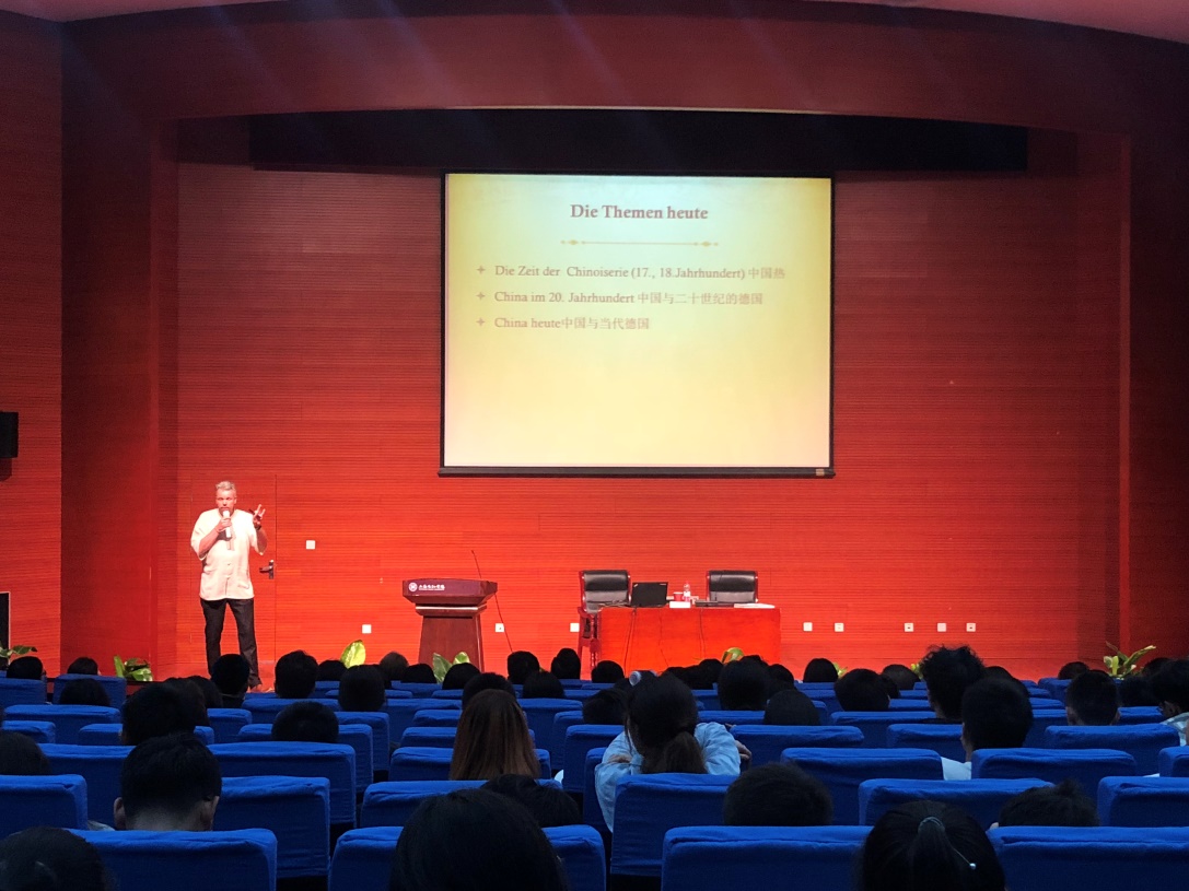 在本次讲座中,马可博士回顾了自17、18世纪以来德国文学作品中、社会文化中的中国形象的变迁,追溯中德两国交流历史,讲述儒家思想和道家思想对德国社会行为的潜在影响。马可博士精彩的讲述引得同学们的阵阵掌声。在提问环节,现场老师和同学与马可博士就增进德国人对中国文化的了解、中国提升国家形象的可行措施、德语语言学习、马可博士个人对中国的印象等问题进行了精彩的对话,现场气氛热烈。