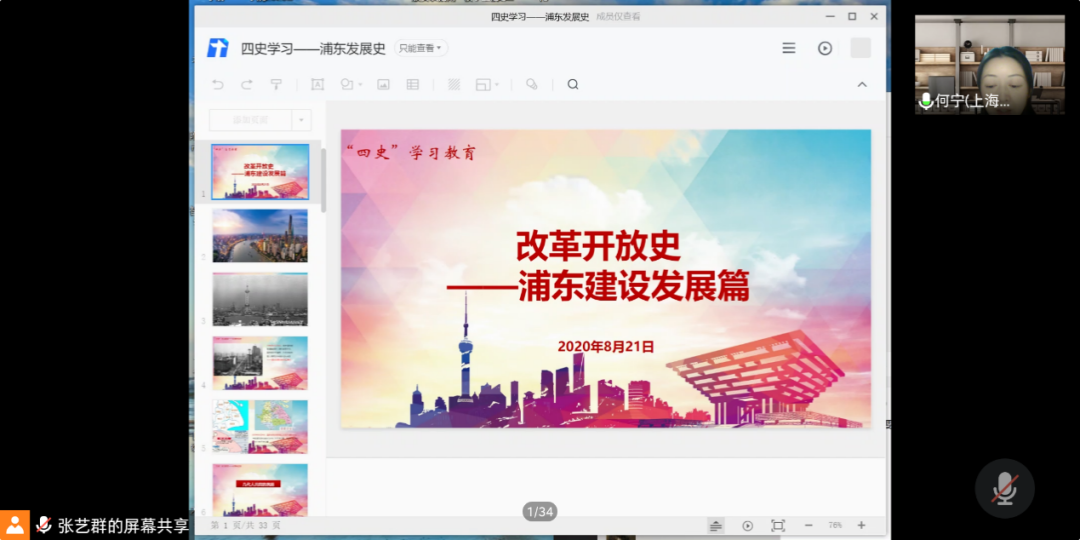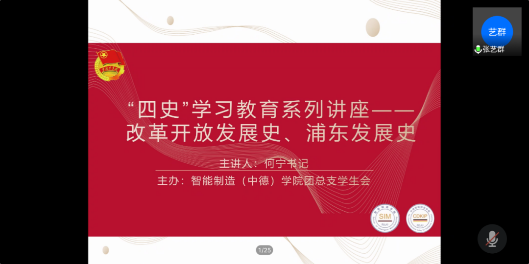 8月21日晚,智能制造(中德)公司通过腾讯会议,在线上举办“四史”学习教育活动。公司直属党支部主持工作副书记何宁老师作了题为“改革开放史—浦东建设发展篇”的讲座,公司团总支书记张艺群主持讲座,全体员工通过网络在线聆听。