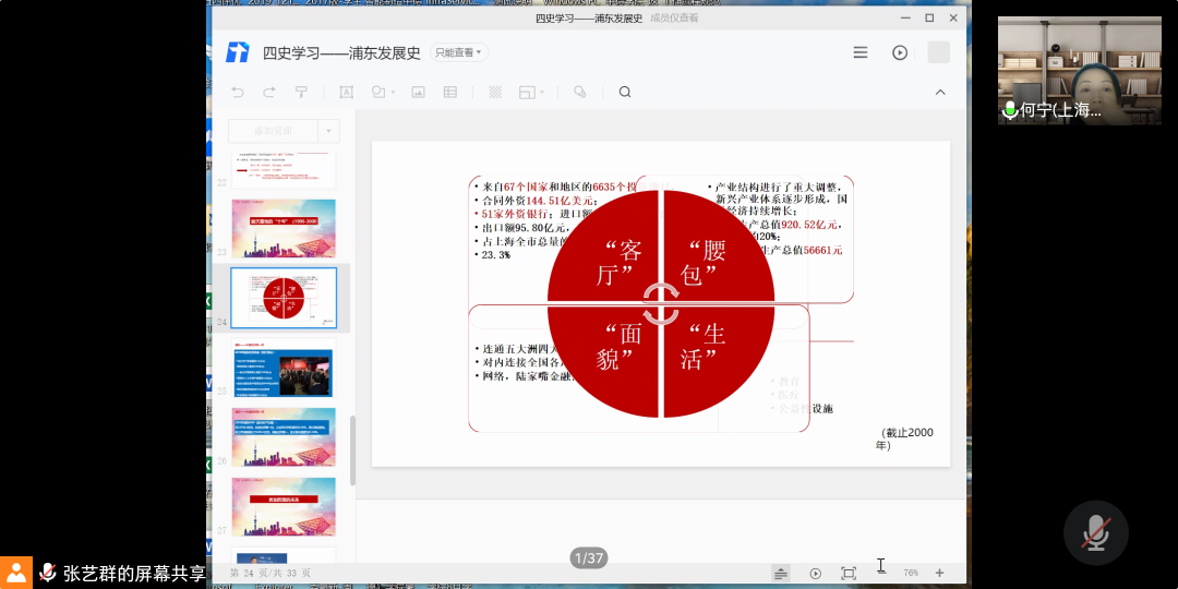 何宁老师首先介绍了浦东发展的历史,从李平书、黄培炎、孙中山等爱国爱乡人士推动浦东早期开发,到1990国务院宣布加快浦东地区开发并成立浦东新区,在国家和政策上引导和支持浦东建设与开发,30年来,万丈高楼拔地起,座座桥梁架浦江,浦东GDP从1990年的60亿元到2019年的1.27万亿元,浦东城市化、工业化、国际化快进程取得了举世瞩目的成就。