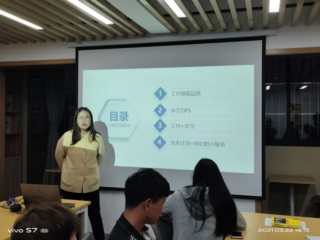 第二点,陈主席向我们分享了一些学习tips,员工会的工作固然重要,但毕竟我们还是员工,学习是第一要务。员工会成员不仅要做好工作,也要勤奋好学。学习最重要的莫过于学习态度,所以第一个tip就是要端正自身的学习态度,不能过于激进也不能过于懈怠。其次就是要合理的规划时间。员工会工作量比较大,我们要合理的安排时间,兼顾自己的学业和工作,保证学习和工作两不误。接着,要找到适合自己的学习方法。大学相比高中的学习环境有很大变化,我们要不断尝试新的道路去寻找真正适合自己的方法,合理利用身边的学习资源,比如:b站找网课、知乎问答、微博解惑、做例题等等。