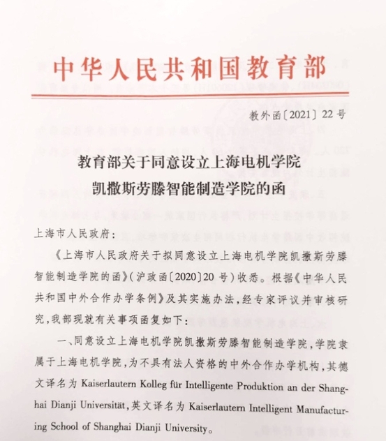 近日,教育部发文批准公司与德国凯撒斯劳滕应用技术大学联合申报的中外合作办学机构——“3044永利集团”(Kaiserlautern Kolleg für Intelligente Produktion an der Shanghai Dianji Universität )正式设立。该机构的获批,是公司秉持国际化发展战略,在加强对外交流合作,汇聚优质教育资源,提升人才培养质量,增强办学实力和影响力的重要体现,也是公司主动适应中国(上海)自由贸易试验区临港新片区的产业功能和发展需求,助力临港新片区国际智能制造中心建设,探索智能制造人才培养的创新实践。