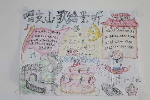 手抄报展示是校园宣传的主要手段之一。不大的白纸上,凝结了员工的心血,展示出他们对党史的认知与看法。手抄报将在中德展示一周。