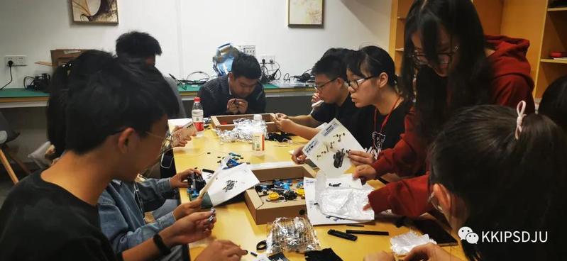 由于时间有限,为了提升制作效率,同学们在每一个大组中进行了明确的分工,有人制作外壳,有人安装轮子,还有人拼接履带。所有人各司其职,每个人都在专心致志的完成自己的工作,同学们的团队协作能力无疑得到了极大的锻炼与提升。