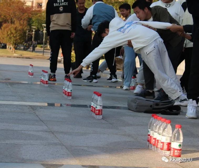 接着,是群龙取水游戏。拿水的队员在规定范围内,经过团队其他队员的帮助,将自己面前的水拿至自己身旁。同学们互相搀扶,出谋划策,在互帮互助之下,完成了游戏。