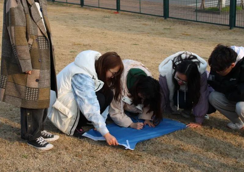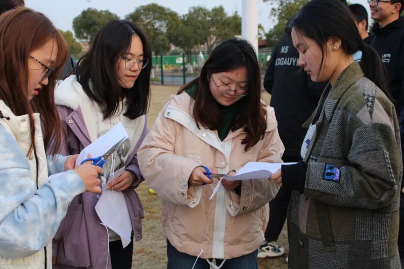 夜幕将至,活动也到了最后环节——多人站纸。这是一个考验智力的小游戏,规定参与者仅使用剪刀,用两张普通的A4纸将全队14人围起来。一番智力斗争过后,两队都完成了目标,并留下了胜利的纪念。