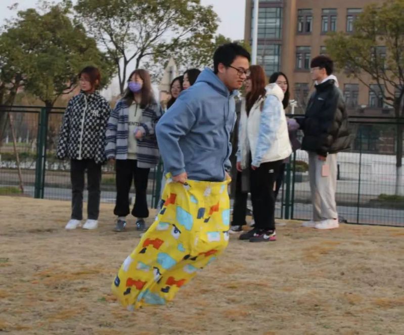 接着是紧张刺激的体力游戏——袋鼠跳接力。八位队员接力,以袋鼠跳的方式完成四个来回,先完成的队伍胜利。队员们争分夺秒,即使不小心摔倒,也会立马爬起来。而这一次,红队队员下定决心,一开始就拼尽全力,誓要和蓝队一决高下。两组队员配合默契,参赛者竭尽全力,啦啦队大声加油。现场气氛被点燃,引来其他同学驻足观看。