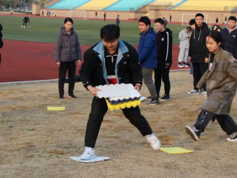 两队首先进行的是踏板过河比赛。它讲究团队合作,依靠队员们的相互配合,在最短的时间内让全队通关。游戏规定每队用10块踏板,让14位队员依次通过50米长的草地,期间脚接触地面的同学需要从头开始,直到最后一名队员顺利通过并收集好10块踏板,则挑战完成。一开始红队掌握技巧,快速传递踏板,领先蓝队。即将完成时却忘记收回踏板,而蓝队有条不紊,集齐所有踏板后冲向终点,最后以0.2秒之差获得了胜利。