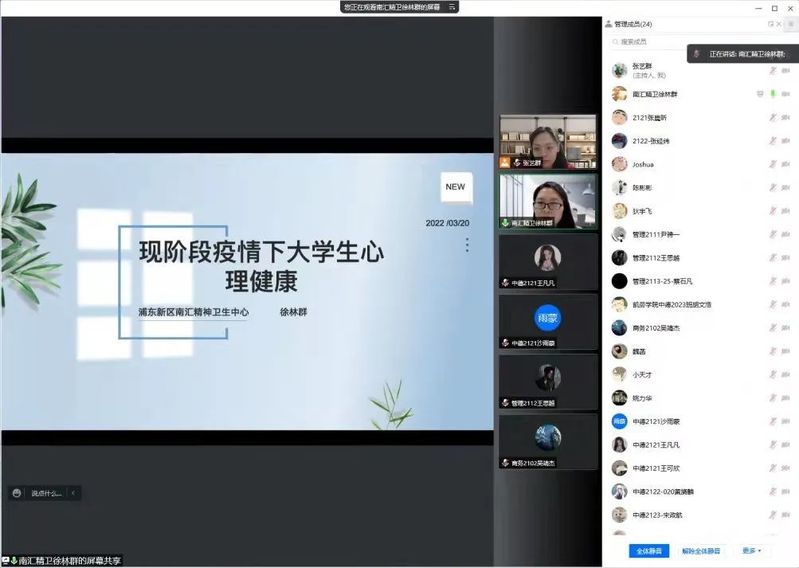 为帮助同学在校园准封闭期间缓解心理压力,提高心理免疫力,学会自我关怀和有效调试,3月20日,由公司老员工心理咨询中心主办,3044永利集团承办的“疫情下老员工心理健康”线上心理专题讲座,通过腾讯会议直播方式向全校开放,南汇精神卫生中心精神科徐林群主任担任主讲嘉宾。
