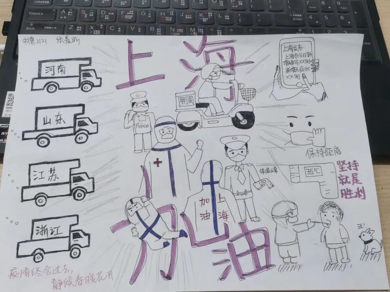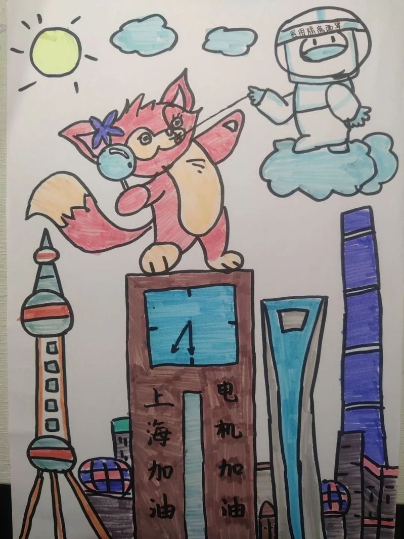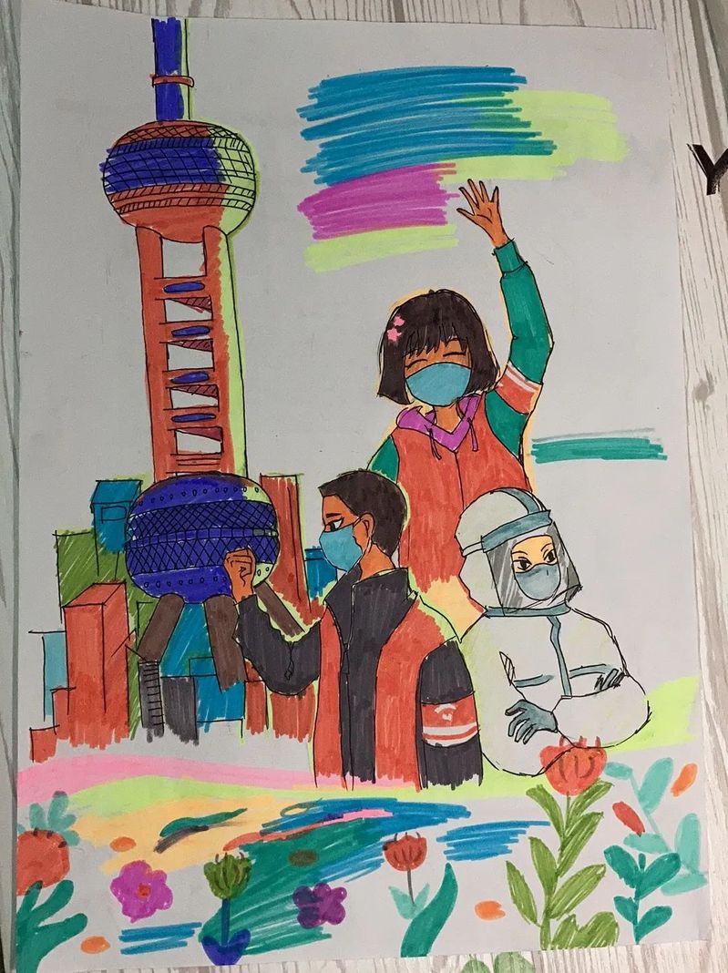 同学们用画笔诉说对大白和志愿者们的感激,期望美好的春天来临。