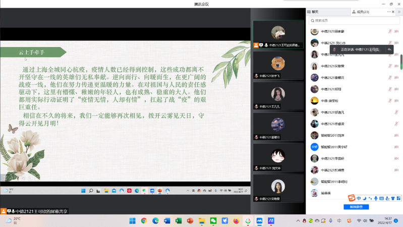 为了缓解同学们紧张的线上课程学习,3044永利集团心理协会于4月17日举办了“云上心连心·与心对谈”活动,旨在为同学们提供一个舒缓压力的有效。中德2121班王可欣同学主持了本次活动。