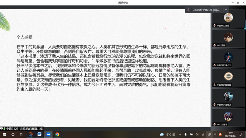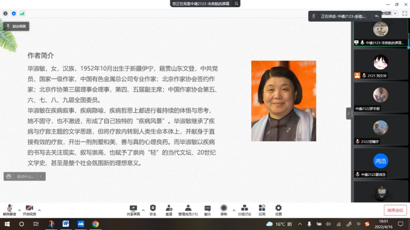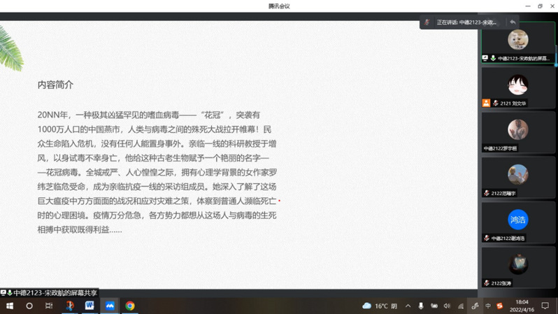 4月16日,为丰富员工们的疫情生活,培养阅读兴趣,提升文化素养。党建中心举办了第三期“读书抗疫 云上享书会”活动。本次活动由2123班的宋政航同学为大家带来《花冠病毒》小说推荐。作者毕淑敏,中共党员,国家一级作家。代表作有《昆仑殇》、《预约死亡》《红处方》等。