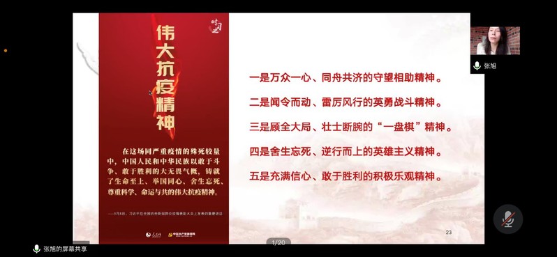 张旭老师首先带领大家重温了习近平总书记在庆祝建党100周 年“七一”讲话中五个“庄严宣告”及其重要意义。“庄严宣告 ”昭示了“坚持真理、坚守理想,践行初心、担当使命,不怕牺牲、英勇斗争,对党忠诚、不负人民”的伟大建党精神。紧接着,她结合当下上海正在进行的抗疫狙击战,从五个”庄严宣告“引申、凝练出五个层面的抗疫精神:一是万众一心、同舟共济的守望援助精神;二是闻令而动、雷厉风行的英雄战斗精神;三十顾全大局、壮士割腕的“一盘棋“精神;四是舍生忘死、逆行而上的英雄主义精神;五是充满信心、敢于胜利的积极乐观精神。张旭老师还特别提到,近期公司每位师生都在用自己的方式贡献对抗疫情的力量。