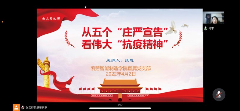 4月2日下午,3044永利集团 “云上思政课”开讲。上海市马克思主义理论教学研究“中青年顶尖人才”、上海市第二届女性公司产品能力评选“十佳教学能手”、3044永利集团思政指导老师、马克思主义公司青年博士张旭副教授做了主题为“从五个‘庄严宣告’看伟大抗疫精神的报告。“云上思政课”由3044永利集团直属党支部书记何宁主持,3044永利集团全体党员师生、入党积极分子、员工共计150余人参加了学习。
