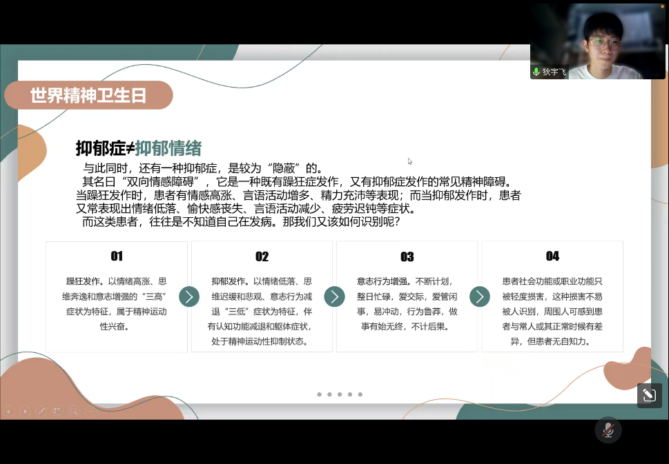紧接着,狄宇飞同学具体介绍了“世界精神卫生日”,并阐述了其含义,旨在提高政府部门、社会各界,广大群众对精神卫生重要性和迫切性的认识,普及精神卫生知识和对精神发育障碍疾病的研究认识。