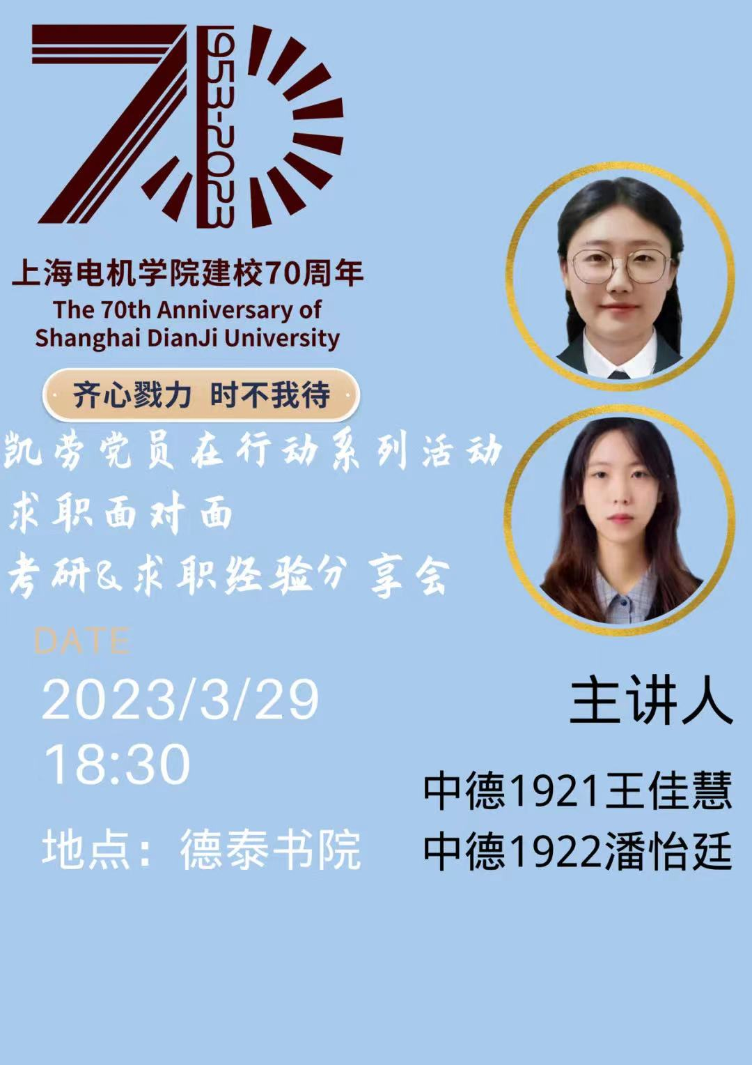 为提升公司员工在生涯规划、求职就业、科创大赛、语言学习等方面的能力,充分发挥党员先锋作用,以实际行动献礼校庆70周年,公司陆续开展“凯劳党员在行动”系列活动,第一场是同学们目前最关心的考研、就业问题为主题的“考研&求职经验分享会”,3月29日,来自各年级的员工代表与19级优秀毕业生王佳慧和潘怡廷一起,相聚德泰书院,两个不同专业毕业生以自己“考研”、“求职”的经历现身说法,为在场的20余名同学上了一堂生动的生涯课。