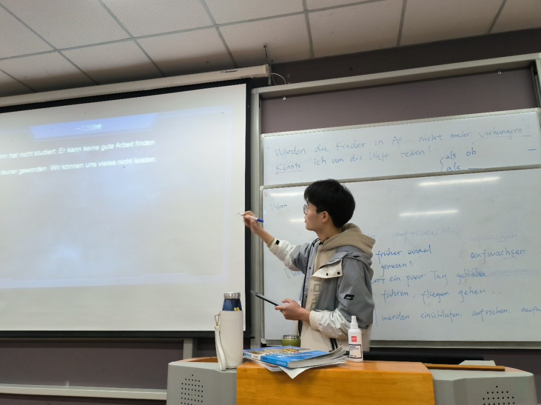 下一个出场的是德语小讲师。他为大家讲解了如何在德语句子中正确运用时态。