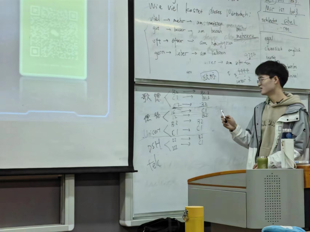 在活动的最后,小讲师给我们分享了关于不同类型德语等级考试的信息,他向我们介绍了各个考试的等级,有效性等,也分享了自己的考试经验并为我们以后参加考试提出了很多建议。