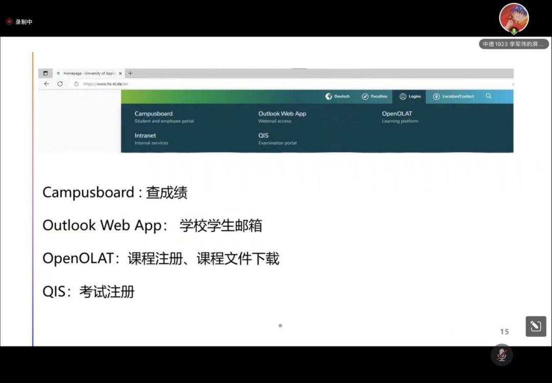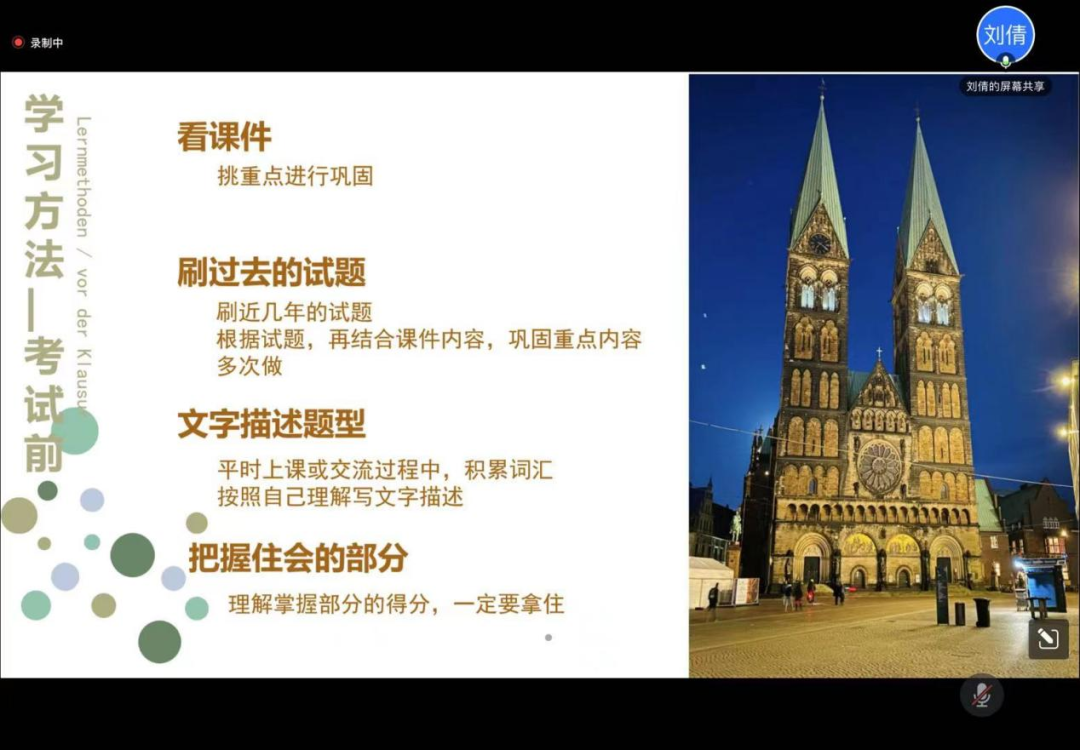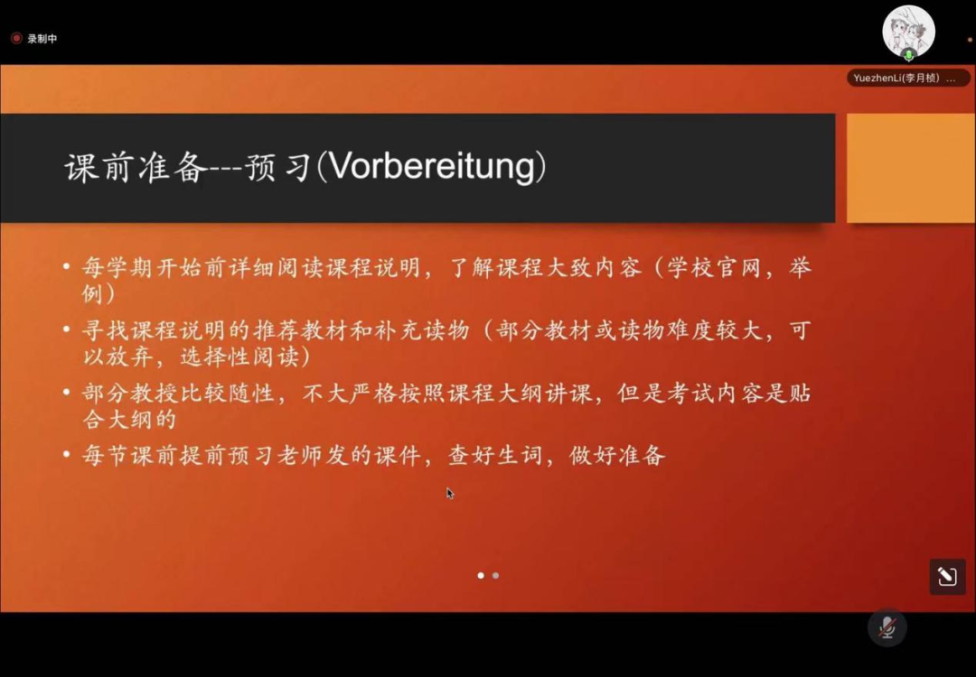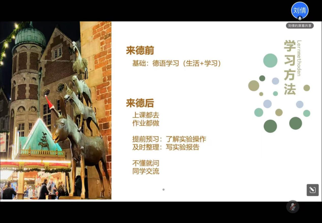 刘倩学姐为我们介绍了在德国的课程安排以及课程分数组成,50%的理论,50%的实验,两者可单独完成。其次为我们提供了学习方法,不仅需要打牢在赴德前的德语基础,还要在德国应做到上课不缺席、作业全完成、提前预习、及时整理、不懂就问和同学交流。同时还要多看课件,刷过去的试题,以及在上课或交流过程中积累词汇等;心态也需要调整好,不要放弃,努力听教授讲课,实验时及时提问,演讲时也不要怕说错。接着说,可以多出去散步或旅游,发展培养兴趣爱好,不要emo。