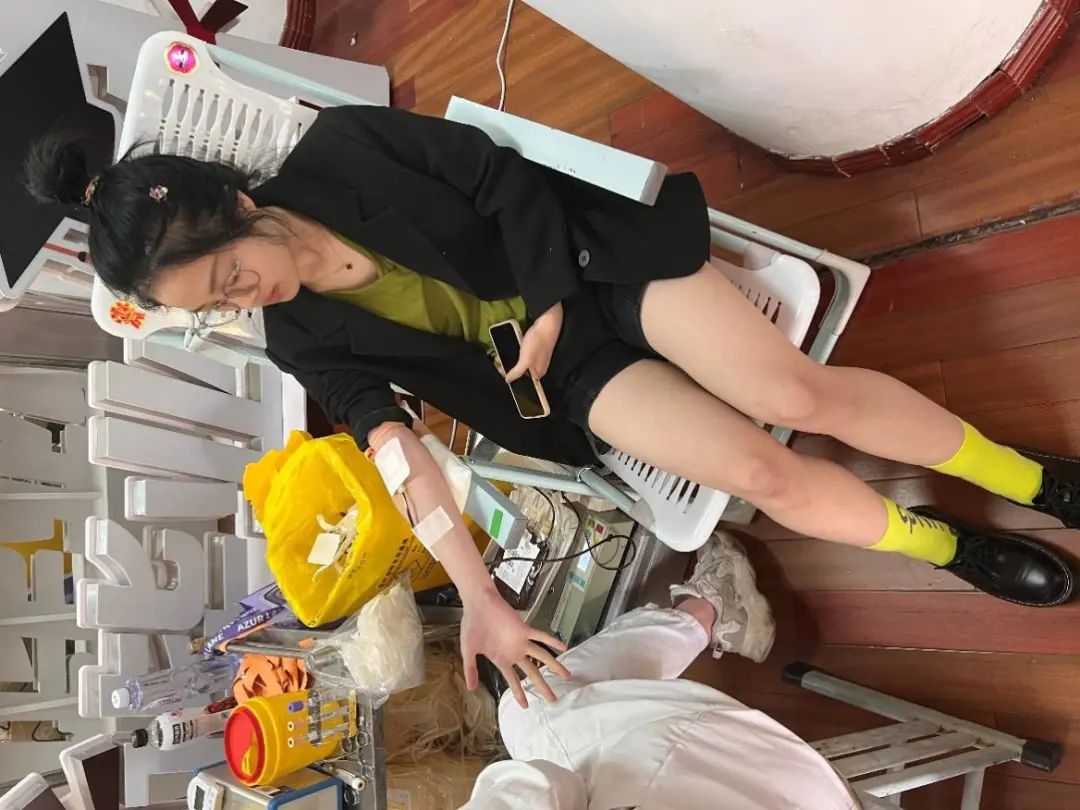 完成身体健康状况预检后,就正式进入献血环节。按照医务人员的要求,调整坐姿、握起拳头、展露手臂。