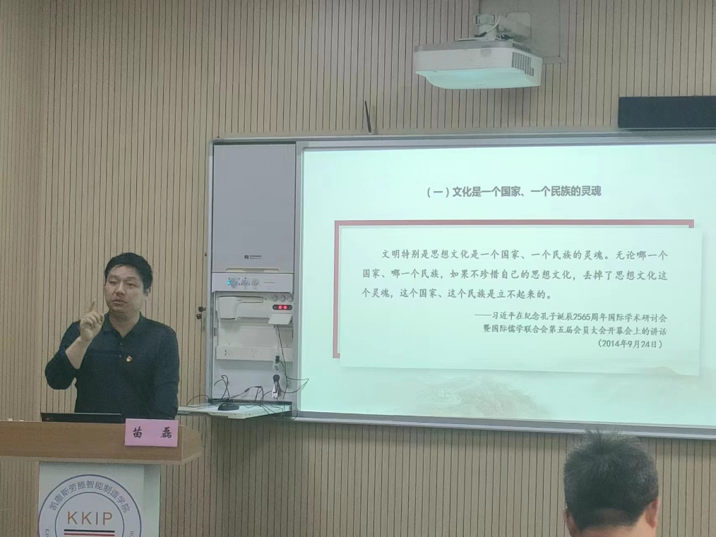 文化繁荣兴盛是中华民族伟大复兴的重要内容,没有人民精神世界的极大丰富,没有民族精神力量的不断增强,一个国家、一个民族不可能屹立于世界民族之林。习近平新时代中国特色社会主义思想指导,要建设具有强大凝聚力和引领力的社会主义意识形态,意识形态关乎旗帜,关乎道路,关乎国家政治安全。苗磊老师讲解了建设社会主义意识形态的几个切实可行的举措,他反复强调,马克思主义是社会主义事业的指导思想,我们必须坚持马克思主义在意识形态领域指导地位这一根本制度,任何时候任何情况下都不能有丝毫动摇,确保我国文化建设始终沿着正确方向前进。