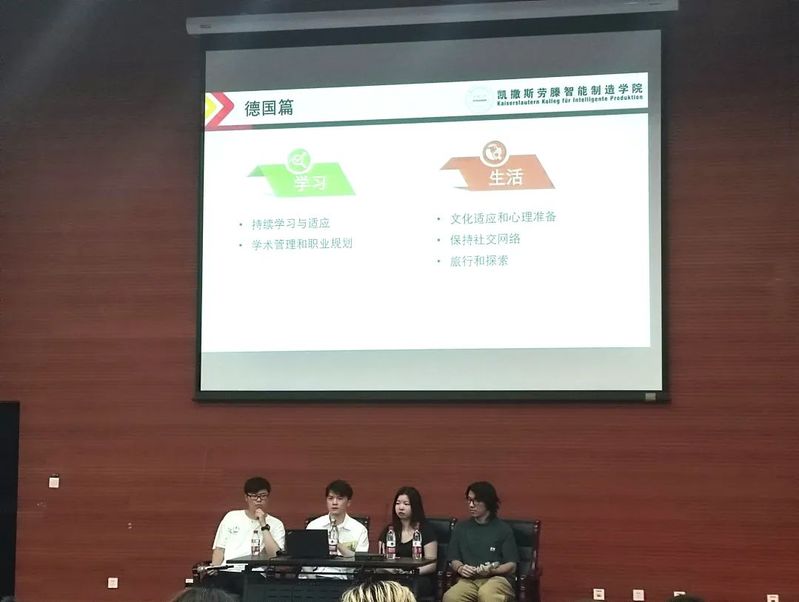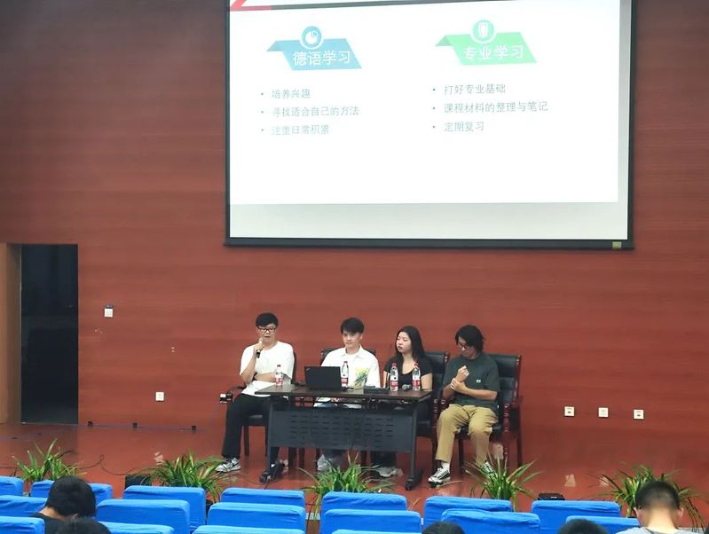 姜天沐学长和张陆原学长提到,德语学习需要培养兴趣,寻找适合自己的方法,并注重日常积累。学长为我们介绍了德国的课程安排和绩点组成,并建议同学们在公司要把德语课和专业课学好,到达德国留学后,德方公司会考察在国内的专业课情况。如果国内的专业课成绩分数理想,那么将有益于在德国留学时的分数绩点。学长建议同学们打好专业基础,认真且及时地完成课程材料的整理与笔记,后续大家也要注重定期复习。张陆原学长特别提到了德国的考试不会提供考试范围,这就需要同学们培养自身主动求学的精神,主动去询问教授或学长学姐关于考题的范围,尽可能去确定考试范围与重点考题。