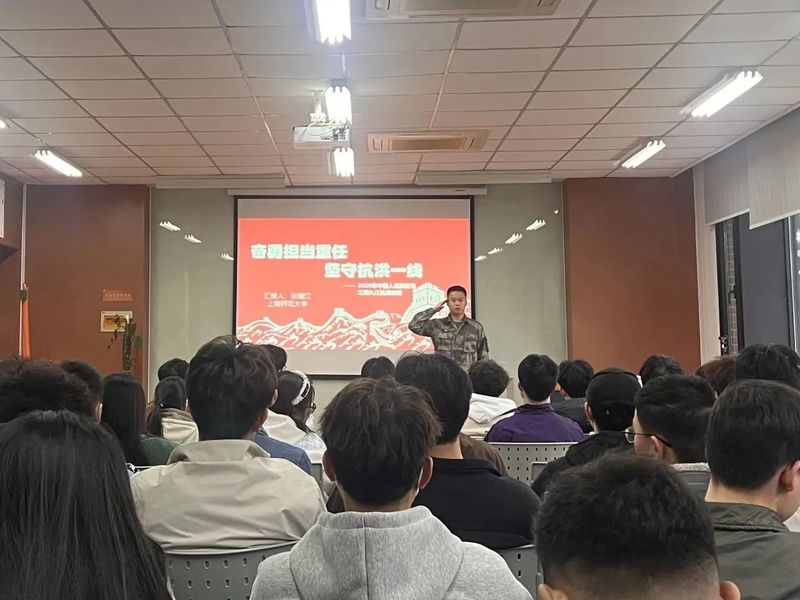 随后,张耀江学长以一位军人的视角向我们分享,在抗洪救灾中,看着一双双求救的目光,一个个寻求帮助的身影,他们不由自主全身心投入到救人工作之中,心中只剩下一个信念:救人,救更多的人。他们甚至累到站立也能睡着,但离去时百姓们扔上车的物资,无数声的感谢和灾后恢复的江河美景成为了他们坚持这份热血的理由。