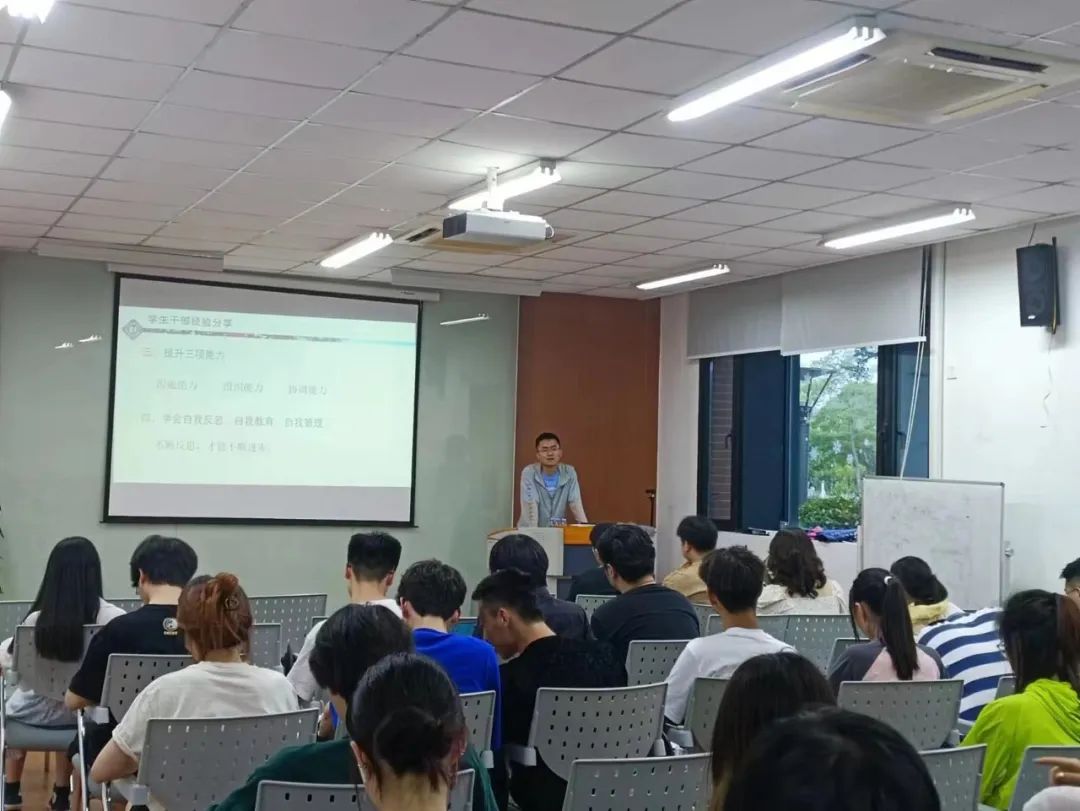 首先,苗凯学长为我们进行了员工干部经验分享。他提出,一名优秀的员工干部应以身作则,起到模范带头作用,对自己的工作内容要有清晰规划,提升沟通能力,组织能力和协调能力,学会自我反思,自我教育,自我管理。