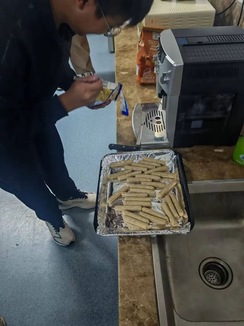 文化之旅后,德式美食DIY环节让现场气氛达到新高。大家围在一起,开始制作经典的德式小吃——香肠芝士烤盘。在外籍同学的细心指导下,同学们将香肠整齐摆放,撒上芝士和香料,等待美食出炉。香肠烤好后,大家品尝着外焦里嫩、香味四溢的香肠芝士,纷纷表示这是吃过的最正宗的德式美食。大家举杯相庆,欢声笑语不断,现场氛围温馨又热烈。