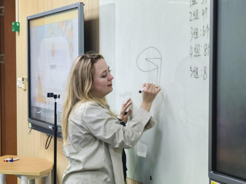 欢乐的气氛中,德语角活动的“你画我猜”德语单词游戏拉开序幕。每组同学轮流上台,通过绘画描绘德语单词的含义,其余同学则在下面紧张猜测。画手们脑洞大开,有的用一笔勾勒简洁而生动的线条,有的则别出心裁,用图案象征单词的意思,现场笑声不断。台下的同学们紧盯着画布,时而开怀大笑,时而认真思索,猜错的惹得哄堂大笑,猜中的瞬间大家纷纷拍手叫好。通过这种轻松愉快的互动,同学们不仅加深了对德语的记忆,也在欢笑中拉近了彼此的距离,语言的学习变得生动而有趣。