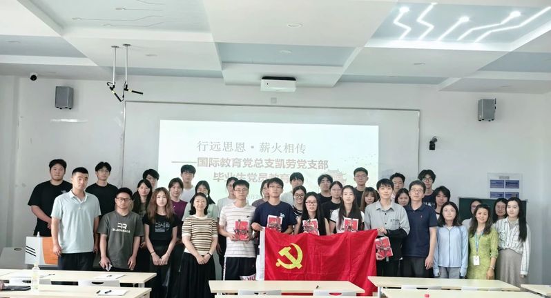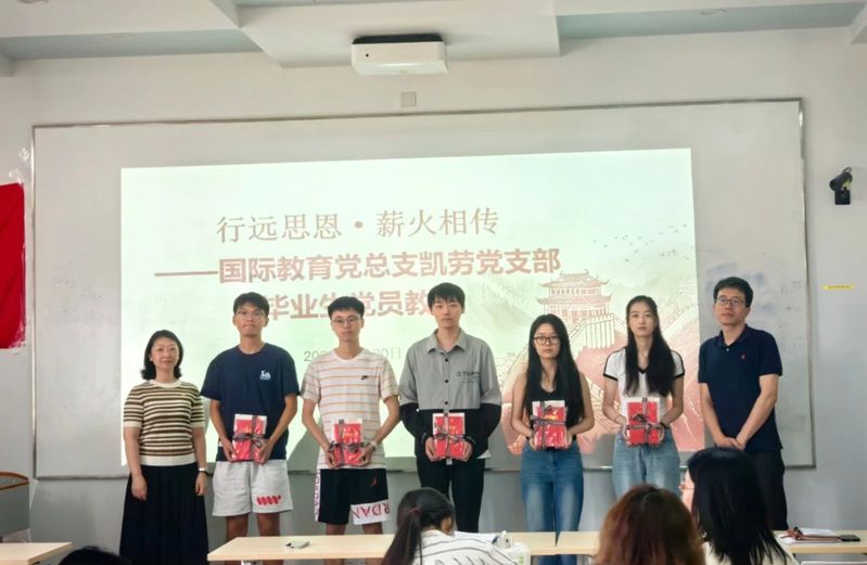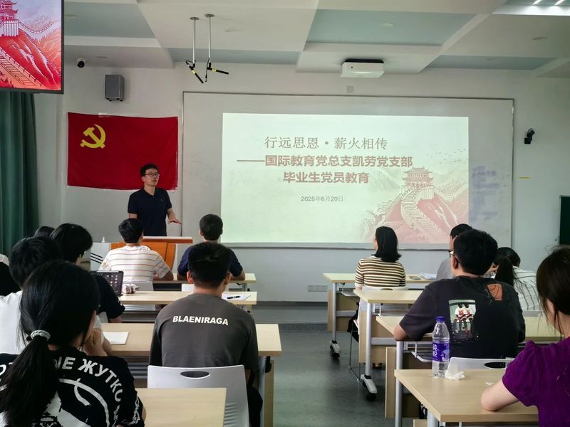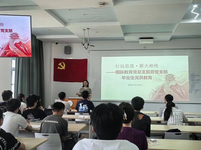 2025年6月20日,国际教育党总支公司党支部在B401教室,为即将告别校园的毕业生党员们精心组织了一场主题为“行远思恩 薪火相传”的毕业生党员教育活动。支部入党积极分子、发展对象、员工党员共40余人一起感受了这场庄重而深情的离校教育。这既是大学阶段党员教育的重要环节,更是迈向人生新征程的思想动员和精神赋能。支部师生共同回顾成长足迹,聆听师长嘱托,坚定理想信念,为青春远航注入澎湃的红色动力。